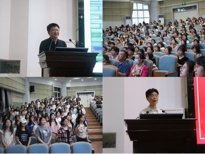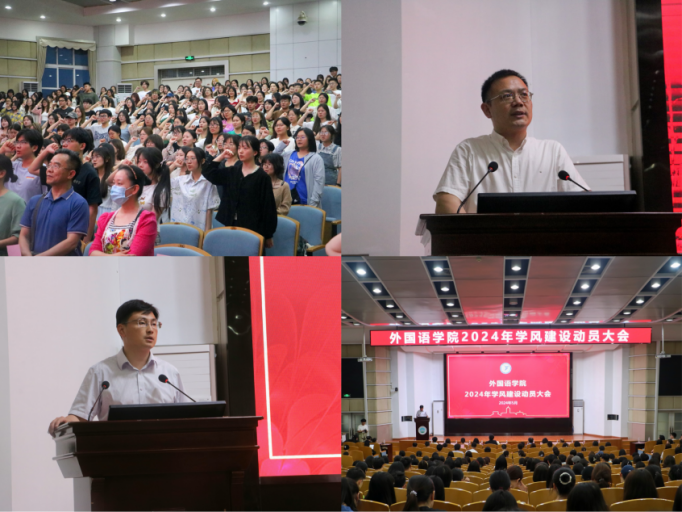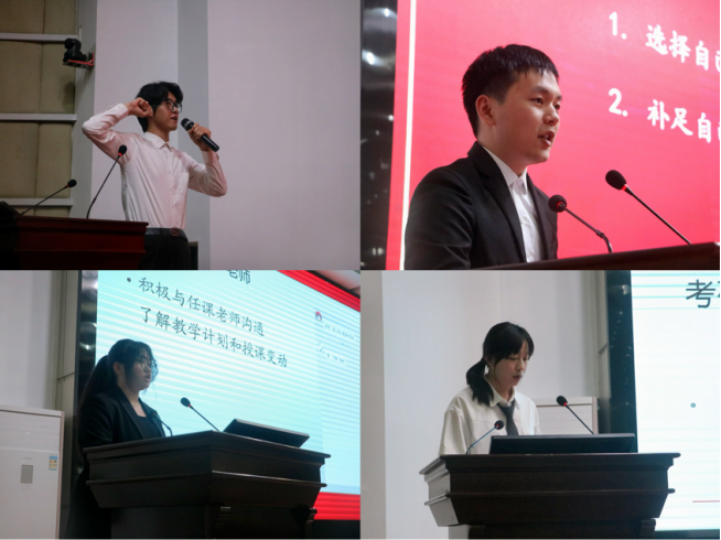 在经验分享与交流环节中,英语(翻译)12201班团支书孙荷昕同学结合自己的学干经历,从“听、想、说、做”四个方面分享了班风建设的经验。“十佳校园明星”、英语(师范)12003班熊佳文同学从自己参与学科竞赛“选、备、赛、思”四个步骤分享了竞赛对自己的帮助。考研先进个人、日语(语言)12001班纪嘉祺同学则通过分享自己的考研心路历程,鼓励同学们奋斗努力比结果更加有意义。2008级优秀校友陈阳博士以“做一名大学生中的六边形战士”为题,从个人成长经历、“外语+”的思考和大学学习建议三个方面建议同学们要注重德智体美劳的深度融合和全面发展。