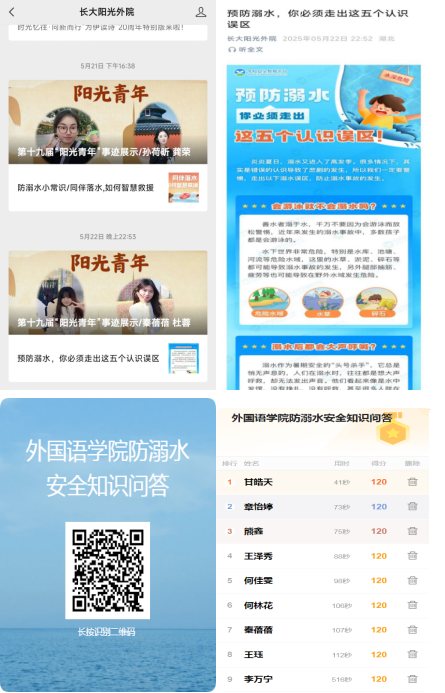 5月26日,学院召开防溺水专题会议,通报了当前防溺水安全形势,布置防溺水安全教育内容和责任分工。假前,各班在线下召开安全教育班会,班主任通过播放防溺水教育视频、分享典型事故案例,带领学生逐条学习防溺水“六不准”要求,并结合划船、漂流等水上活动安全注意事项,强调选择正规场所、穿戴救生装备的重要性。在线上,学院依托QQ群、微信公众号等平台,定期推送防溺水安全知识、警示案例及假期水域风险预警,并通过“同题共答”线上答题活动,强化防溺水安全知识巩固。