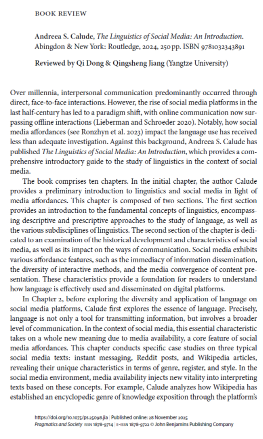 (通讯员 许泽琼)近日,taptap点点体育二年级硕士研究生董琪以第一作者身份在国际著名语用学SSCI、A&HCI双检索期刊、JCR二区期刊Pragmatics and Society上发表书评,文章题为Review of Calude (2024): The Linguistics of Social Media: An Introduction。文章的发表在一定程度上体现了taptap点点研究生培养的质量。学院将继续提升研究生的科研能力,进一步提高学生培养质量。