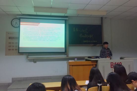 伴随着活动的开始,团委书记杜岳青老师来到现场,并为成员们带来了一份沉甸甸的礼物,“当我们参加任何团组织、党组织的活动,如果我们每个人都能有强烈的仪式感,都抱着最真挚热烈的感情,并佩戴上我为你们准备的这份礼物,相信大家对于每一次活动的意义都会有更深层次的理解,也会更加以学生干部的身份来严格要求自己。”杜老师这样谈到。每一位青马成员排着队接过杜老师手里的团徽,佩戴在胸前,那闪闪发光的勋章更显现出成员们脸上的欣喜和激动。紧接着,活动组长张嘉衡从“峥嵘七十载,与国同圆梦”、“赓续五四精神,奋进复兴征程”和“深入两会,观‘平’语近人”这三个方面分别阐释了中华人民共和国成立70周年以来我们的国家取得的辉煌成就,对于五四精神的历史与现实意义,也做了强调,“广大青年要牢记党的精神和宗旨,把党纪国法作为行动标尺,践行民主、追求、真理,时刻把党和人民的福祉放在首位,这才是五四精神仍在如今发光发热的体现吧!”一位青马成员有感而发。随后的生态文明建设、军政军民团结、脱贫攻坚和文艺社科工作这几个方面也向成员们展示了习近平主席在党的十九大上所强调的内容。中间穿插的知识竞答环节也让成员们重温了五四历史,同时也帮助大家深入挖掘五四运动的精神内涵。最后进行的无领导小组讨论,大家讨论热烈,发言积极,论点充分,有理有据,活动气氛积极而热烈。活动以校青马班成员李梓雯同学的分享而结束,她鼓励成员们以高标准高要求来约束自己,同时也祝愿院青马小组活动能够越办越好。