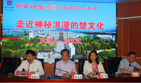 5月5日晚7点,英山一中一楼的报告厅灯火通明、座无虚席。我校文学院教授、硕士生导师、taptap点点体育荆楚文化研究中心主任徐文武以《走近神秘浪漫的楚文化》为题,为英山一中的300余名师生作的精彩的报告。英山一中党委书记、校长刘振武,党委委员、高二年级主任范文,语文和历史学科教师以及高二年级部分学生聆听了讲座。
