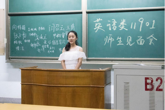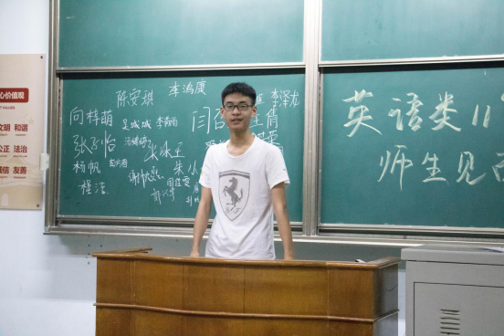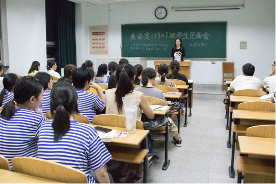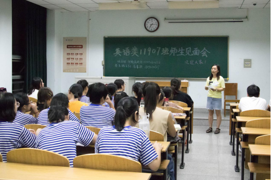 见面会伊始的自我介绍环节,教室里便此起彼伏地充斥着热烈的掌声。同学们第一次站上大学教室的讲台上,在黑板上书写下自己的名字,彰显着各位新生们已经在自己大学生活的起点上留下了浓墨重彩的一笔。紧接着,他们又用精彩的自我介绍让其他同学认识自己。他们不仅介绍了自己的家乡、兴趣爱好等,有的同学甚至讲到了自己的外号,以新奇而有趣的方式让其他同学了解了自己;有的同学说自己喜欢哆啦A梦,因此身材也向着它发展……精彩纷呈的介绍让整个见面会轻松而活跃。其中,英语类六班的老师则给同学们提出了一个小规则,让本就精彩的自我介绍更加别开生面。老师要求同学们在介绍自己前,先回忆一遍在自己前面做自我介绍的同学的名字,说说自己的前后左右是谁,然后再用家乡话进行自我介绍。于是大家听到了来自湖北、山东、广东、江苏、天津等各个地方的同学们所讲的方言,在感受到地域文化差异的同时,也感受到了大学的丰富多彩。