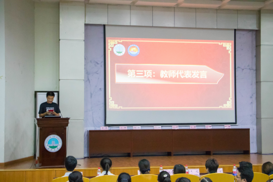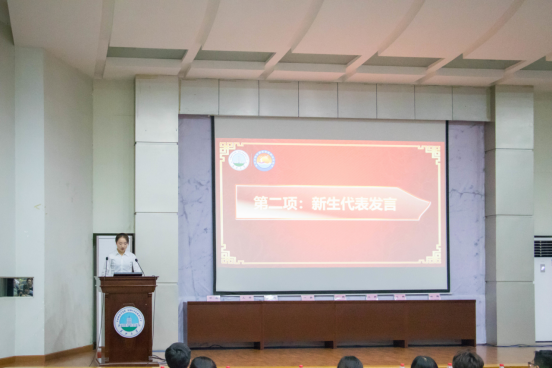 嘉宾发言完毕后,进行演辩社辩论表演赛《过程与结果何者重要》,大四辩论组和大二大三辩论组相互对抗,才子佳人,舌战群儒,八位辩手,各显神通。在场的师生听得聚精会神,时而掌声连连,时而捧腹大笑,十分有趣。辩论会结束后,高年级学生代表岳睿欣同学上台发言,她提出“经历挫败并从中学习,是成长的必经之路,而大学,就是需要你在挫败中反思,在问题中寻找方向。”大学生活已拉开帷幕,希望19届新生们能够珍惜当下,让青春不留遗憾,不负韶华,不负自己!