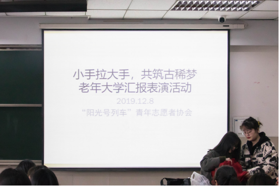 (摄/郑甜 罗娜 文/韩思洁 范期明为弘扬志愿者“奉献、有爱、互助、进步”的精神,同时向老人们传递关爱与温暖,12月8日上午九时三十分,taptap点点阳光号列车全体成员在14教南小广场开展了主题为“小手拉大手,共筑古稀梦”的汇报表演活动。志愿者、老人们共同参与。