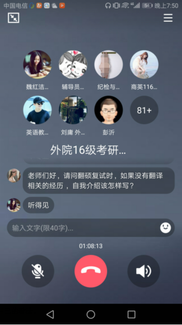 在新冠肺炎防控严峻阶段,随着全国研究生考试初试成绩陆续放榜,国家线还没有公布的情况下同学们宅在家中怎么准备复试呢?为了更好地服务考研学子,学院学工办开展了以“考研复试”为主题的学情调查,并于2月28日晚7点在学院考研交流QQ群里举办了语音答疑交流会。会议邀请到研究生导师谈宏慧,谢家成,彭沂,田传茂,陈松松等5位老师为同学们答疑解惑,有85人同时在线参会。