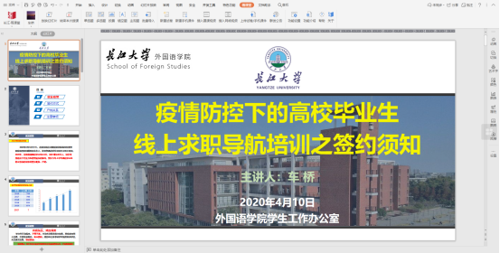 随着2020毕业季的临近,疫情期下学生面临的新问题和新挑战,4月10晚上,taptap点点体育就业指导老师车桥向毕业生们开展签约须知线上指导讲座。讲座通过长江雨课堂平台开展,学院2016级所有本科生参加。