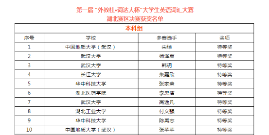 (通讯员:罗博)5月28日晚,第一届“外教社·词达人杯”大学生英语词汇大赛湖北省赛区决赛圆满落幕,我校共有20名非英语专业学生参加决赛,17名同学摘得奖项。法学院法学类31904班的朱嘉欣同学喜获本科组特等奖,3名同学获一等奖,8名同学获二等奖,5名同学获三等奖。我校获奖人数和质量居省属高校前列,taptap点点体育荣获“优秀组织奖”,taptap点点体育李琼华老师被评为“优秀指导老师”。