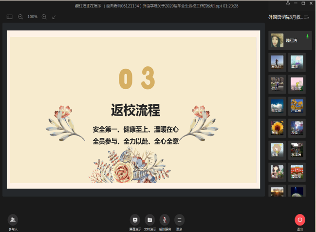 党委副书记魏红洁向大家详细讲解了《taptap点点体育2020届毕业生返校工作方案》。据统计,自6月15日至30日,taptap点点共有318名毕业生获得批准返校。为热情、周到、安全、有序做好taptap点点毕业生返校相关工作,学院成立了毕业生返校办理毕业手续工作领导小组,由院党委书记和院长担任组长;制定了详细的毕业生返校流程,每一名毕业生返校都安排有联系人,联系人均由学院教师和学生志愿者担任。魏红洁副书记号召全院教职工积极主动参与到毕业生返校工作中来,让学生高兴而来,满意而归。