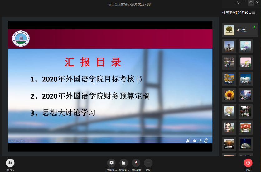 最后,院长谈宏慧向大家讲解了学院与学校签字的《2020年taptap点点体育目标考核书》主要考核指标情况;对学院2020年的财务预算进行了讲解和说明;对学校要求组织开展的“taptap点点体育办学思想大讨论”进行了安排部署,6月21日前以系(部、室)为单位组织开展讨论,6月23日学院组织集中研讨交流,各系(部、室)选派代表进行交流发言。她希望全院教职工积极参与到办学思想的讨论中来,主动为学院“十四五”规划的制定建言献策,促进学院健康稳定发展。