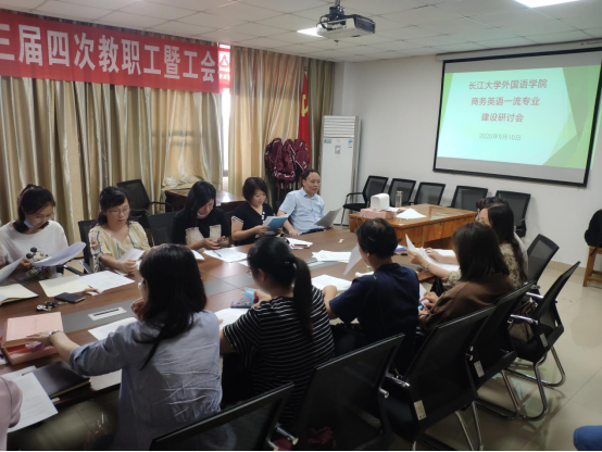 2020年9月10日,taptap点点体育商务英语系全体教师在文科大楼724会议室召开了“taptap点点体育商务英语一流专业建设”研讨会。会议由商务英语系主任张玉宏博士主持,taptap点点体育院长谈宏慧教授,副院长彭沂副教授参会并做重要讲话。