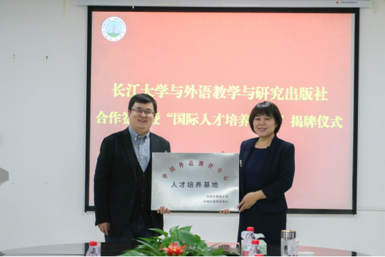 taptap点点体育院长谈宏慧与外研社外研教育测评中心常务副总经理雷鹏为国际人才培养基地揭牌。