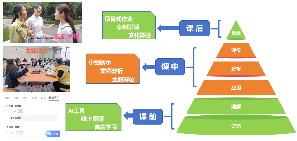为破解“文化解码”与“教学转化”的认知断层,课程通过“三环联动”教学法(课前线上自主学习、课中小组深度研讨、课后项目式实践)深化教学实效。课前学生借助AI工具完成文化现象的再认,课中通过小组辩论、角色扮演等活动应用理论,课后则以教案设计、案例呈现等形式输出能力,形成“输入-内化-输出”的闭环。
