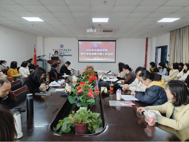 随后,程坤作学科竞赛工作汇报,从工作成绩、存在问题、体系建构及重点措施四个维度展开。在工作成绩方面,他指出2025年学院各语种、各赛项呈现“多点开花”态势,高水平赛事实现获奖数量与质量双提升,竞赛对人才培养的赋能成效显著;同时,他深入剖析当前存在的师生参与覆盖面较窄、竞赛类型布局不均、高层次奖项占比不足、竞赛成果转化培育机制不完善等问题,并提出以构建赛教研贯通融合的学生学科竞赛生态体系为努力方向,围绕学科竞赛的价值定位、培育路径及增长点与参会教师交流工作思路。最后,他从“以教赛融合促进学风建设、以优化管理赋能成绩突破、以贯通融合健全机制体系”三方面,对2026年竞赛工作作出具体部署。