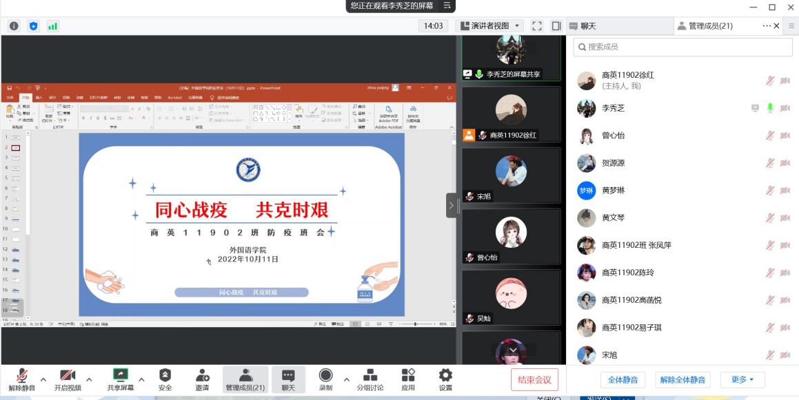 为打赢校园防疫保卫战,更好地做好学生疫情防控工作,10月11日,全院本科生班级和研究生小组在线上召开了疫情防控专题班(组)会,会议由班主任和导师主持和主讲。
