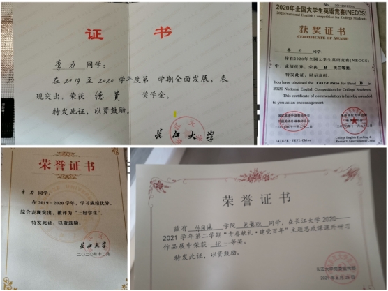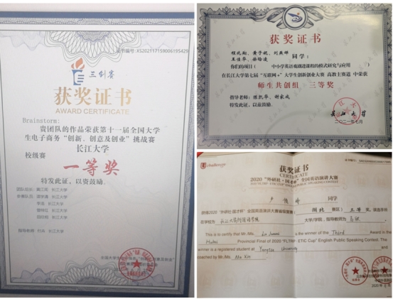 我们奋发图强,事事争先,着眼远方,不因眼前的小小成绩而自满,不忘把知识能力运用到各种学科竞赛中。2020年11月,卢俊炜同学在2020 “外研社· 国才杯”校园辩论赛中荣获一等奖,在2020“外研社·国才杯”全国英语演讲大赛省级复赛湖北赛区中荣获三等奖。2021年6月,以黄江闻同学为组长的团队在第十一届全国大学生电子商务“创新、创意及创业”挑战赛taptap点点体育校级赛中荣获一等奖。2021年7月,王佳华、徐晗凌同学在taptap点点体育第七届“互联网+”大学生创新创业大赛高校主赛道中荣获师生共创组三等奖。同学们的共同努力为这个大家庭迎来了一个又一个里程碑的时刻,他们的知识在刻苦勤奋下日益增长,同时他们卓越的学习精神将陪伴他们一生,使他们在未来发展成为企业精英,社会的顶梁柱。
