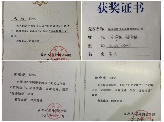 在大学的象牙塔里,努力学习专业知识和各类文化的同时,我们在一项又一项的课余活动中取得了可人的喜果。同学们热爱外院的阳光文化,积极参与阳光文化节的活动。其中,王佳华、徐晗凌、向楠、郭兴宇、付文雨等同学被评为taptap点点体育第十五届“阳光文化节”活动积极分子,其中王佳华、徐晗凌同学获得“优秀演员”称号。在开展红歌大合唱排练活动时,班上所有同学积极参与此次演唱并表现优秀。褚金帆同学在2020年taptap点点体育体育舞蹈比赛中获得双人拉丁组第二名。丰富多彩的课外活动,既增强了班级的凝聚力,又使同学们在紧张的学习生活之余得到调节。