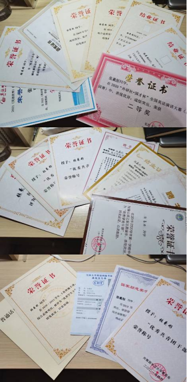 大学期间我担任了素拓队宣外部的部长,英语12108班班级助理、英翻11902班班长兼团支部书记、英语11902班学习委员等多项学生干部职责,负责组织各项重大活动,大大提升了我的办事效率和能力;我的演讲力和领导力也获得了提升,拥有了站在一个小至十余人、大至上百人的群体面前讲话而从容不迫、娓娓道来的勇气和底气。在工作中,我发现自己站在了一个更全面的角度来观察、审视、推动队伍和班级的工作:我学会如何用自己的热情带动部门内的工作,意识到各方面因素在工作中的重要性,渐渐学会了从更宏观、更深层次地看待问题和工作。经历了大学四年的不断进步,我的努力也获得了认可,我也有幸获得taptap点点体育“万人创百星·学干之星”、优秀学生干部、优秀共青团干部、三好学生等多项荣誉称号。