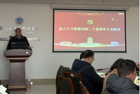 学校党委常委、宣传部长江万哲老师为全体党员讲授学习贯彻党的二十届四中全会精神专题党课。江常委围绕全会召开的时代背景、核心要义与实践要求展开讲解,解读党的二十届四中全会的时代意义与“十五五”规划战略部署,强调全会是我国迈向基本实现社会主义现代化的关键时期。他结合外语专业特点指出,青年党员要将专业学习与国家高水平对外开放、文化繁荣任务结合,增强讲好中国故事的本领,以青春之力投身民族复兴。
