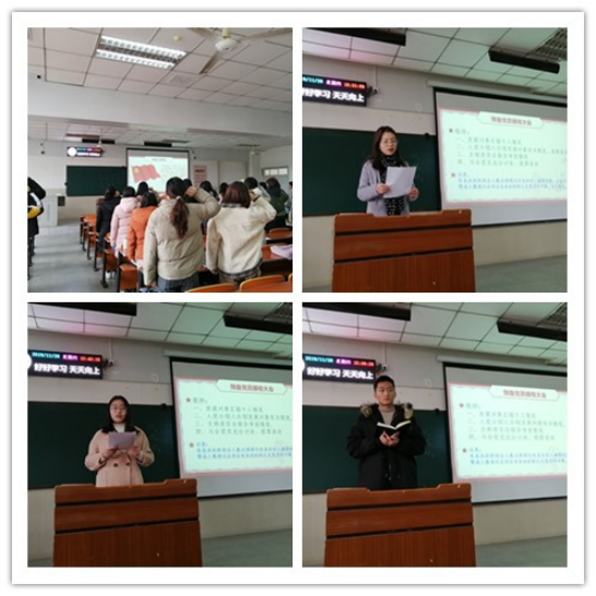 参加活动的全体党员在吴杰同学的领誓下重温入党誓词。随后石月月、柳娜、葛涛、陈舒、张婷婷等同学领读了党章第九、十、十一章关于党组、党和共青团的关系、党徽党旗的具体内容,罗歌、李文佳、吴杰、彭秦、宋汶霏、万嘉琦、黄丹妮、史文双、王玲、牟霖子、吴晓纯、高宁等同学领读了《习近平关于“不忘初心、牢记使命”论述摘编》的第六章和第七章的部分内容。