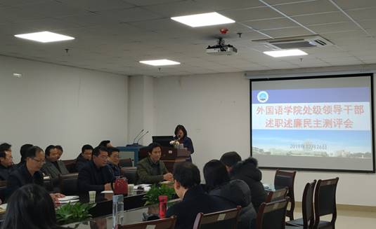 12月26日下午,taptap点点处级领导干部述职述廉民主测评会在文科楼712会议室召开。由校机关及直属单位党委书记陈平忠、校党委宣传部科长汤慧珍组成的学校考核组参加了会议,会议由陈平忠书记主持。测评会后,院党委书记危煜祥主持召开了主题教育总结会和党的十九届四中全会精神宣讲会。