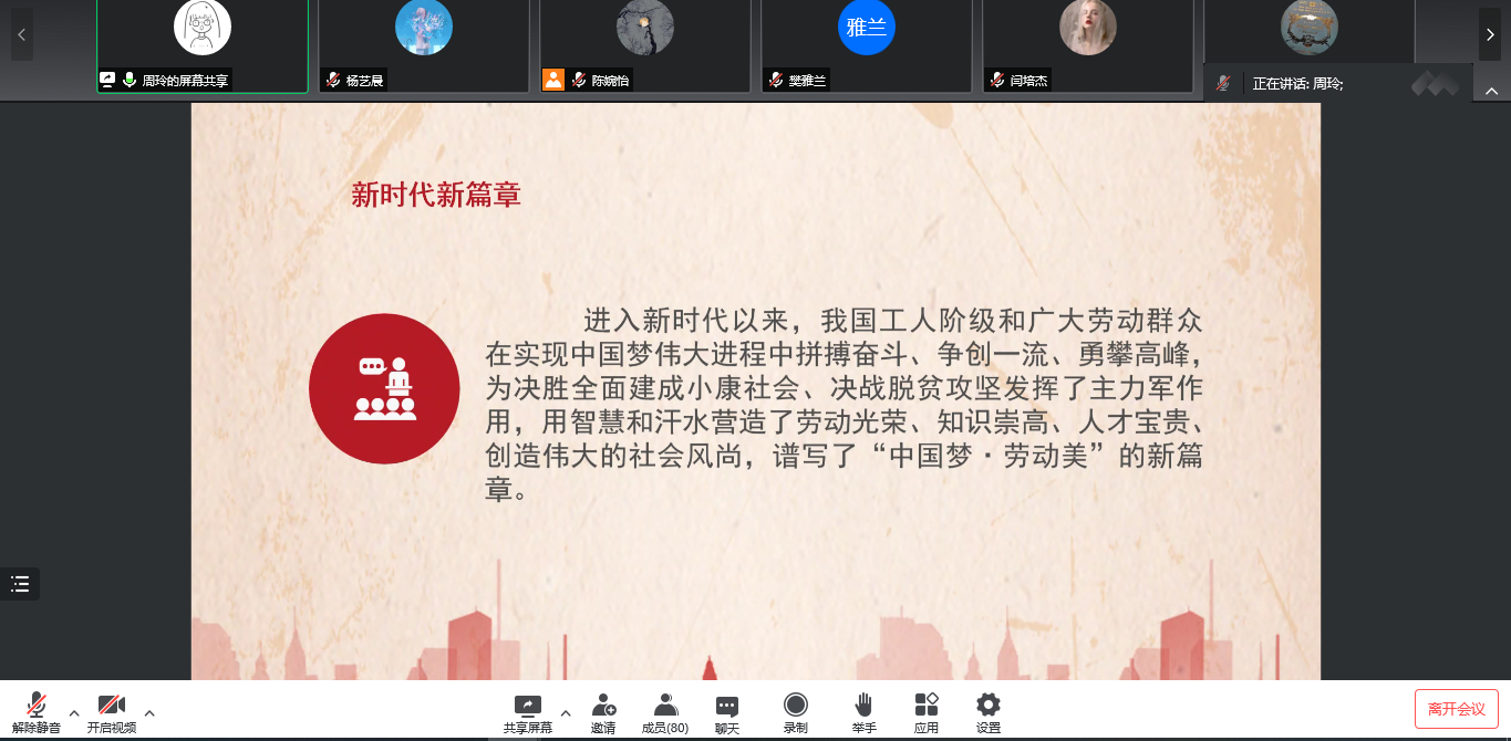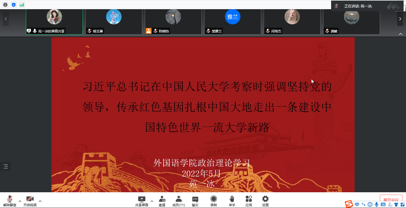 会议伊始,21级英语笔译苑一冰同学介绍了习近平在中国人民大学考察时的讲话,激励大家求真务实,做勇担民族复兴重任的时代新人。随后,21级学科英语潘怡西同学汇报学习了习近平在中共中央政治局常务委员会会议上的讲话,呼吁同学们团结一心,配合学校防疫工作。20级学科英语龙晨同学介绍了习近平总书记的两封回信以及两封贺信,强调广大青年要奋发进取,投身建功新时代。20级英语笔译刘雅琴同学以及21级外应吴丽同学共同带领大家学习了习近平在庆祝中国共产主义青年团成立100周年大会上的讲话,呼吁大家认真学习领悟习近平总书记重要讲话精神,为实现中华民族伟大复兴的中国梦而不懈奋斗。最后,20级外应周玲同学介绍了“劳模精神”——中国共产党人的精神谱系之十九,希望大家增强创新意识,刻苦钻研,用奋斗书写最美青春。