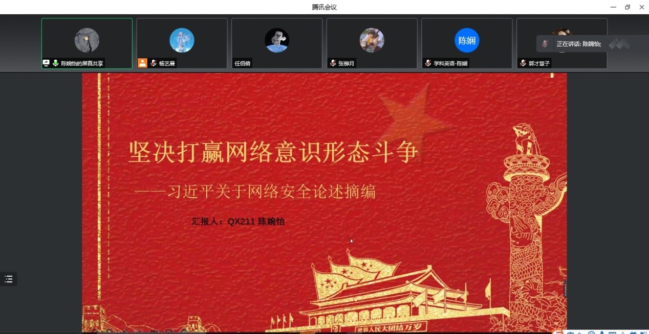 继续深入进行党史总结、学习、教育、宣传。20级英语笔译张柳月同学带领大家学习了习近平总书记在北京冬奥会、冬残奥会总结表彰大会上的讲话,指出要发扬北京冬奥精神,向着实现第二个百年奋斗目标以及实现中华民族伟大复兴的中国梦奋勇前进。21级外应陈婉怡同学汇报了习近平总书记关于网络安全的论述摘编,网络空间是亿万民众共同的精神家园,要坚决打赢网络意识形态斗争,维护国家政治安全。最后,21级英语笔译杨艺晨同学带领大家学习了中共中央办公厅印发《关于推动党史学习教育常态化长效化的意见》,推动党史学习教育常态化长效化是建设马克思主义学习型政党的一项长期重要任务,要用好党的百年奋斗重大成就和历史经验,在新的赶考之路考出好成绩。