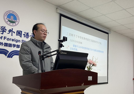 江万哲表示,习近平文化思想开辟了马克思主义文化理论的新境界,为新时代文化强国建设提供了行动指南,赋予了中华优秀传统文化新的时代内涵。学习贯彻习近平文化思想是立足新时代党领导文化建设的实践,是着眼建设中华民族现代文明的目标,更是建设社会主义文化强国的基石。他强调,各位党员同志在学习贯彻习近平文化思想的过程中要从党对社会主义文化建设认识规律中把握习近平文化思想的历史逻辑,从“两个结合”中把握习近平文化思想的理论逻辑,从“七个着力”中把握习近平文化思想的实践逻辑。他希望,全体党员同学一定要坚持和培养文化自信,特别是要通过实践活动等方式去传播中华优秀传统文化。