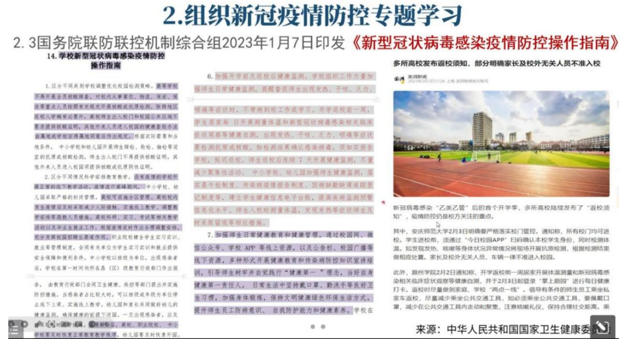 2月4日-5日,各班组织召开开学前安全主题班会,班主任在会上详细宣讲了返校报到的具体条件和流程,强调先申请后到校,非批准不返校;然后,班主任们组织学生重点学习了国务院联防联控机制综合组2023年1月7日印发的《新型冠状病毒感染疫情防控操作指南》,强调学校疫情防控要求,提升学生健康安全责任意识;最后对返校后的开学考试纪律要求及学习生活也进行了提示。