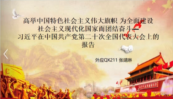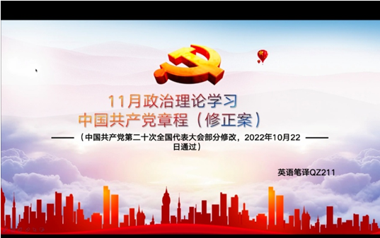 会上,外国语言学及应用语言学21级研究生张靖琳带领大家学习了习近平总书记在中国共产党第二十次全国代表大会上的报告;英语笔译21级研究生吴珺汇报了学习《中国共产党章程(修正案)》的体会,让大家进一步了解了党章的制定及其修订过程;学科英语22级研究生程丰娟带领大家学习十九届中央纪律检查委员会向中国共产党第二十次全国代表大会的工作报告,强调党员要严格遵守党的纪律和党章,坚持以身作则;英语笔译22级研究生焦倩倩带领大家学习了习近平总书记在党的二十大闭幕会上的重要讲话精神,倡议大家认真学习领会习近平总书记重要讲话精神,为实现中华民族伟大复兴的中国梦而不懈奋斗。学科英语21级研究生冷依萍传达了《中共中央关于认真学习宣传贯彻党的二十大精神的决定》文件。