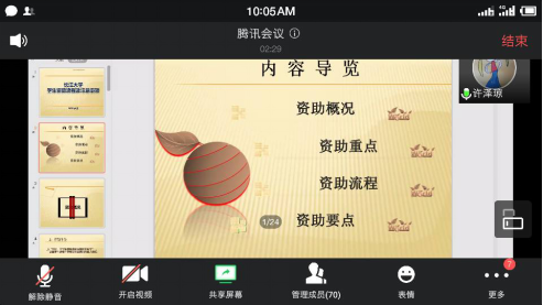 620日,taptap点点体育学工办通过腾讯会议开展了资助育人专项会议。会议由院团委书记兼资助专干许泽琼老师主持,2017级学生干部、获得过资助的学生以及想申请资助的学生参加了会议。
