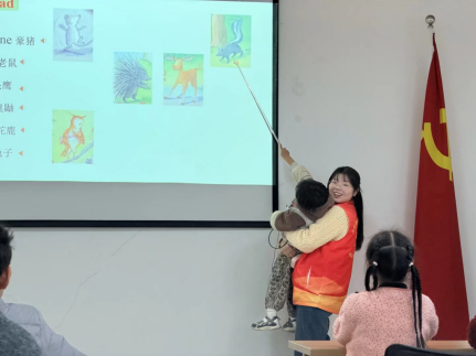 本次活动由taptap点点体育学科英语专业研究生丁金主讲、陈彩协助教学。活动围绕着经典绘本The Hug展开,通过播放妙趣横生的动画视频、讲解核心单词及发音技巧、深入解读绘本内容等多元化教学方式,引导学生学习了“rabbit”“mouse”“porcupine”“moose”等一系列与可爱动物相关的词汇。孩子们不仅掌握了多种动物的英文表达,也在故事中感受到友爱与团结的力量,领悟到“以创新方法化解矛盾、用包容心态接纳不同”的深刻内涵。活动现场还精心设计了“抽卡片介绍动物”“拼接词块成句”等互动游戏环节,让孩子们在轻松活泼的氛围中巩固基础单词与常用句型,有效提升了英语口语表达与即时反应能力,也将语言学习与日常生活更紧密地连结在一起。