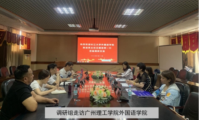 6月11日下午,调研组走访了广东外语外贸大学阐释学研究院,该院是我国阐释学研究的重要基地,在该领域有较高的学术影响力。阐释学研究院院长陈开举教授热情接待并详细介绍了阐释学的概念内涵和发展历程。他还生动地解读了荆楚文化的内涵,使调研组老师对阐释学及区域文化有了更深入的理解。双方探讨了共同建立“阐释学与荆楚文化研究”课题的可行性。广东外语外贸大学国际商务英语学院徐章宏教授、肖武东老师和阐释学研究院博士后殷立飞也应邀出席座谈。调研组与各位专家就英语专业的人才培养目标、就业情况、跨文化课程开发、访问学者项目等议题进行了深入的交流探讨。