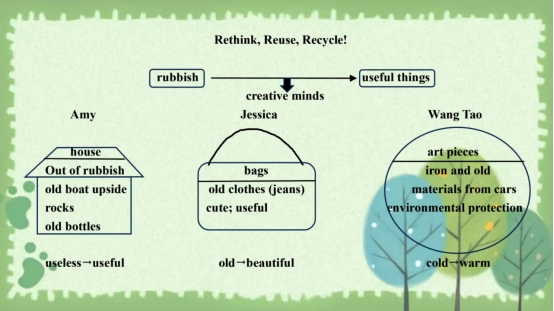 活动开始,李贝同学以人教版九年级全一册Unit 13 We are tring to save the earth中的SectionB(2a-2e)部分为授课内容,课型为阅读课。导入阶段,李贝同学采用图片的方式引导学生思考如何将废弃塑料瓶变废为宝,并引导学生根据图片对文章进行预测。在读中环节,分别设计了Fast reading和Careful reading两个活动引导学生探讨语篇内容。另外,对于语篇中所出现的前缀和后缀进行讲解,加深了学生对英语中前后缀的理解和应用。整篇文章帮助学生挖掘出了在语篇背后所传达的教育意义和主题意义——保护环境,从我做起。