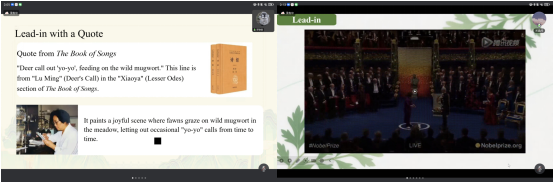 最后一组是由连诗涵、朱泉润和邓杨弋三位同学进行讲解,赵晨老师进行点评。赵晨老师由于工作原因,未能开麦,由蒋老师进行代点评。蒋老师指出连诗涵组逻辑稍混乱,建议调整环节顺序,突出时间轴,但是项目式作业设计出彩,同时前部分需加强学生互动。朱泉润组结构分析清晰,但问题设计需细化动词;AI技术应用新颖,天平采用很有特色。邓杨弋组lead in比较直观但是开始就提出问题,学生无法回答,问题链设计需连贯,建议纵向排列解决过程;homework要求不明确,需提供模板并明确评估标准,让学生做时间轴并完成各时间段任务是一个很好的亮点,可以与学生积极互动。